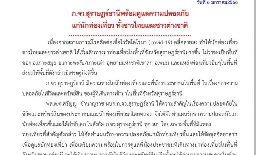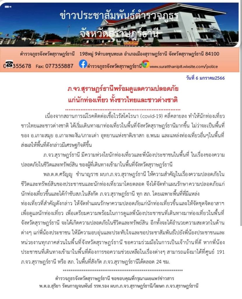 ตำรวจภูธรจังหวัดสุราษฎร์ธานี พร้อมดูแลนักท่องเที่ยว 10 มกราคม 2566 โดย khaoniphan13 / ข่าวประชาสัมพันธ์,ข่าวประชาสัมพันธ์,ข่าวฝากประชาสัมพันธ์