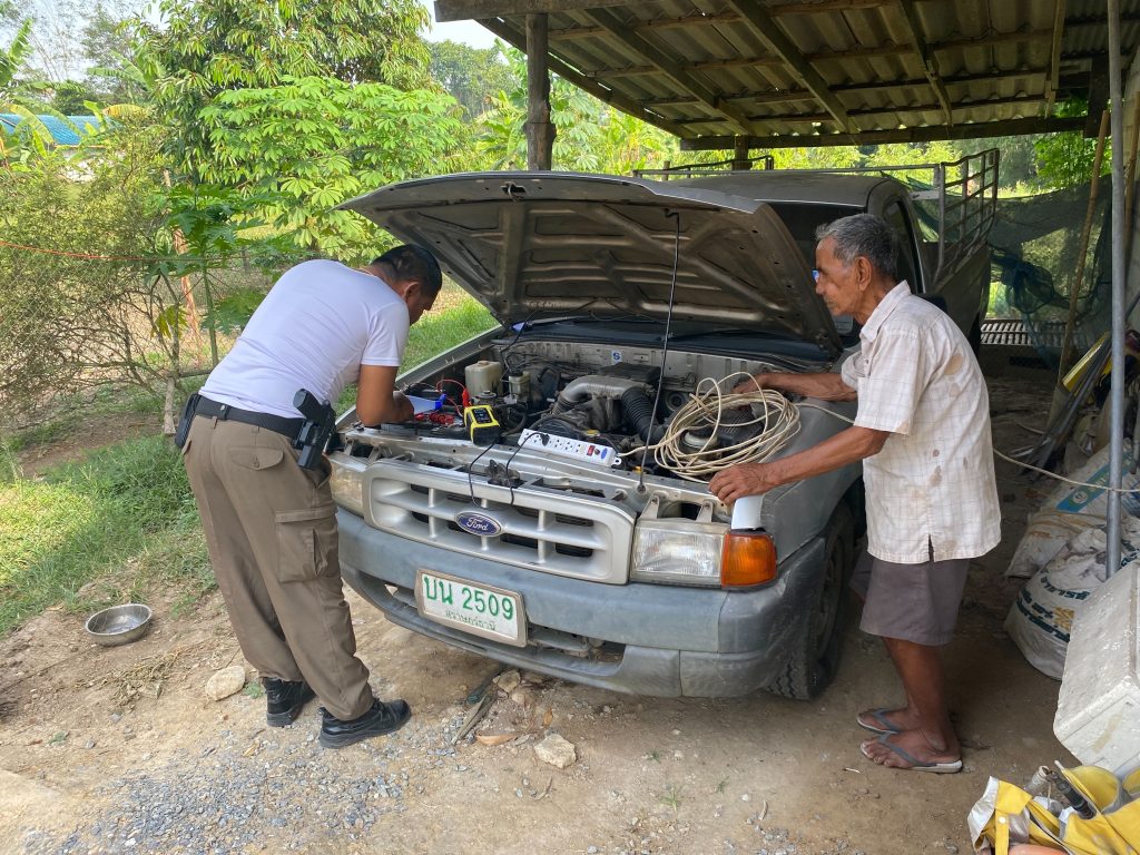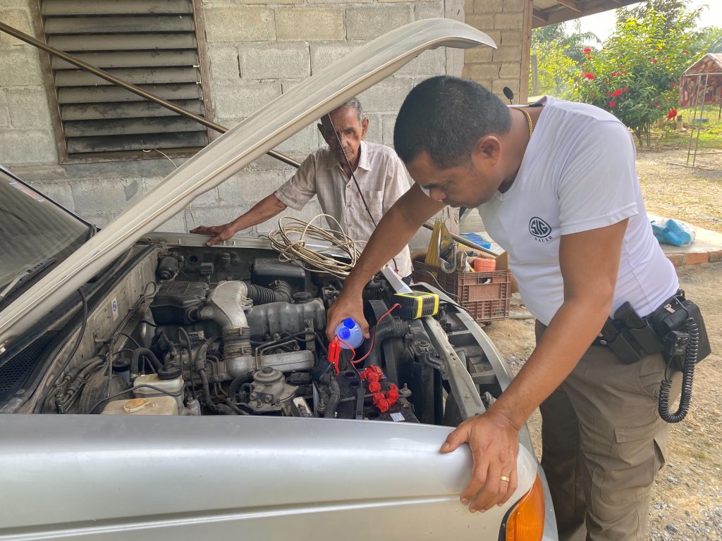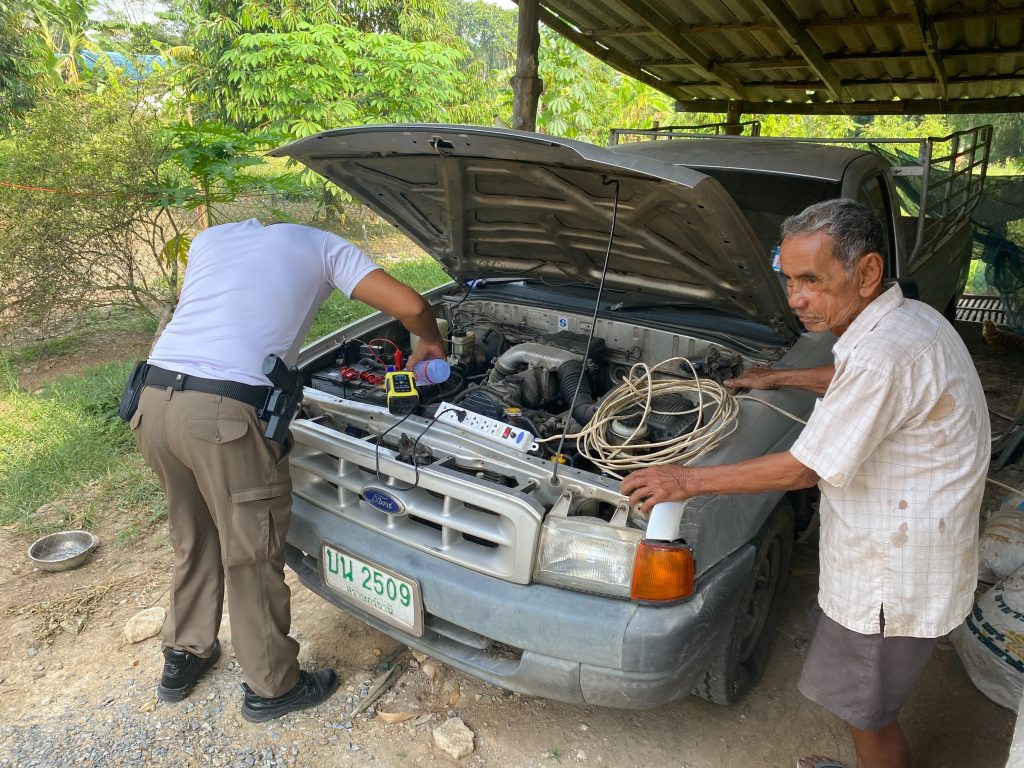 ประชาชนในพื้นที่ ม.2 ต.เขานิพันธ์ ขณะจะออกเดินทางรถมีปัญหา จึงได้ขอความช่วยเหลือ เจ้าหน้าที่ตำรวจได้เข้าดูแล ทำการช่วยเหลือโดยการจัดหาน้ำกลั่นและชาร์จแบตเตอร์รี่ ให้เครื่องยนต์สามารถสตาร์ทติดได้ และสามารถให้ใช้งานได้ต่อไป