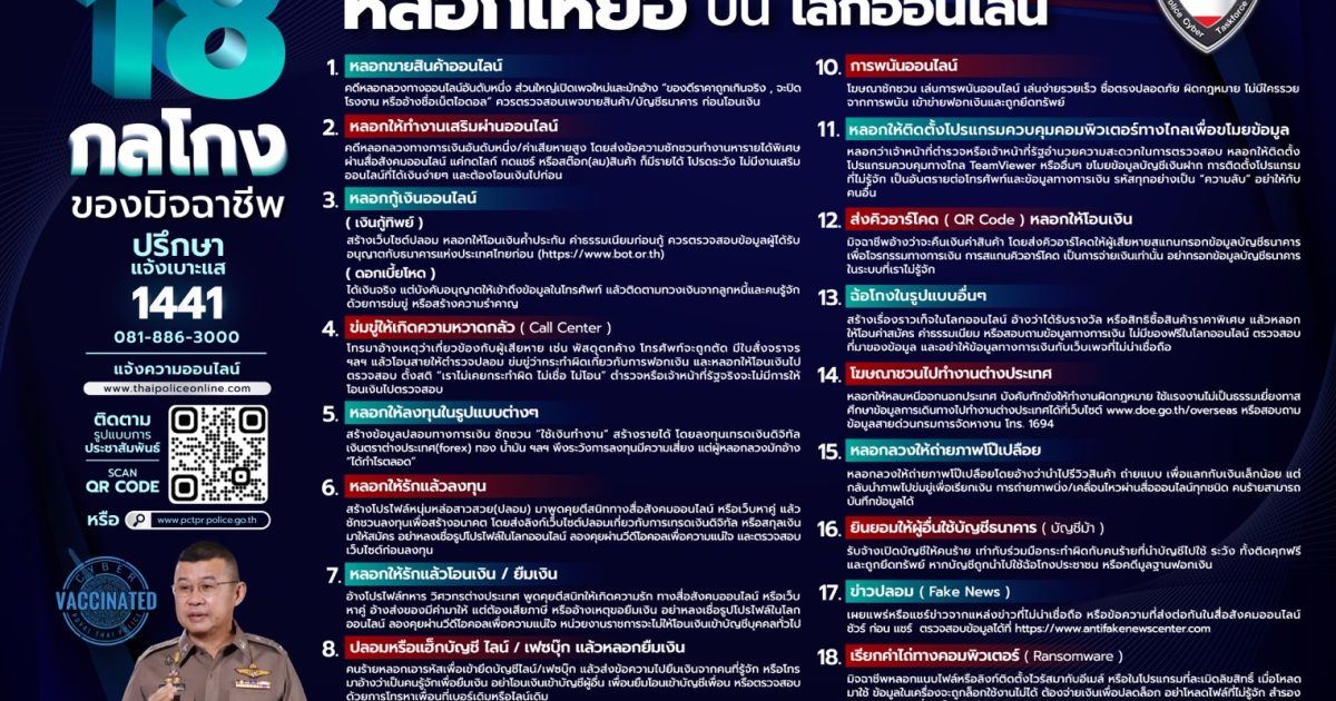 ประชาสัมพันธ์ การป้องกันอาชญากรรมทางเทคโนโลยี่ (Cyber Vaccinated) 18 ข้อ กลโกงมิจฉาชีพ เผยแพร่สื่อไซเบอร์วัคซีน ให้ประชาชนเพื่อสร้างความรู้ไม่ให้ตกเป็นเหยื่อของอาชญากรรมทางเทคโนโลยี เป็นการป้องกันเหตุ โดยให้ประชาชนประเมินตนเองด้วยความสมัครใจผ่านเกมคำถามผู้พิชิตไซเบอร์วัคซีน เพื่อประเมินว่ามีความเสี่ยงในการตกเป็นเหยื่ออาชญากรรมทางเทคโนโลยีมากน้อยเพียงใด