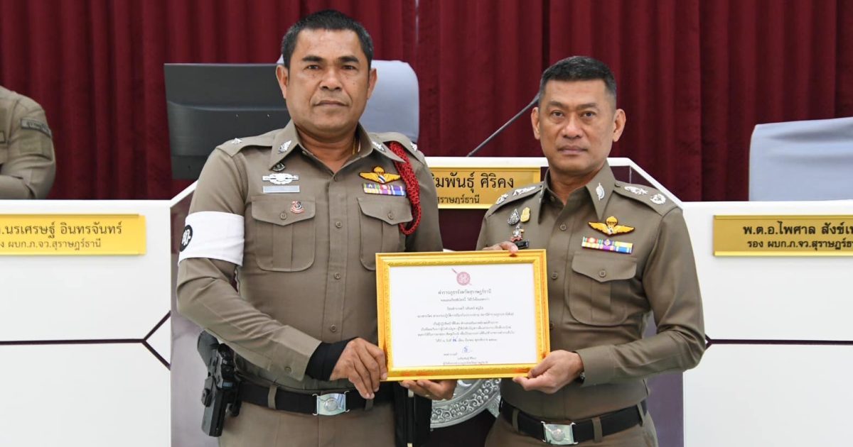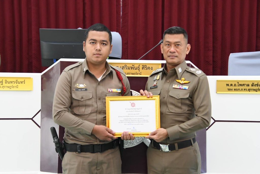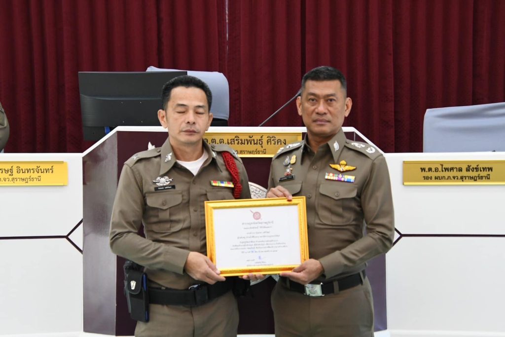 มอบประกาศเกียรติคุณให้แก่ ร.ต.ต.บดินทร์ หนูนิล รอง สว.(ป.)สภ.เขาสิพันธ์, ด.ต.นันทภพ วงศิวิวัฒน์ ผบ.หมู่ (สส.)สภ.เขานิพันธ์, ส.ต.ท.เจษฎา สมภักดิ์ ผบ.หมู่(ป.)สภ.เขานิพันธ์