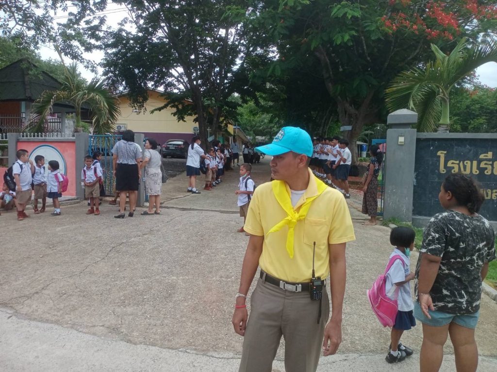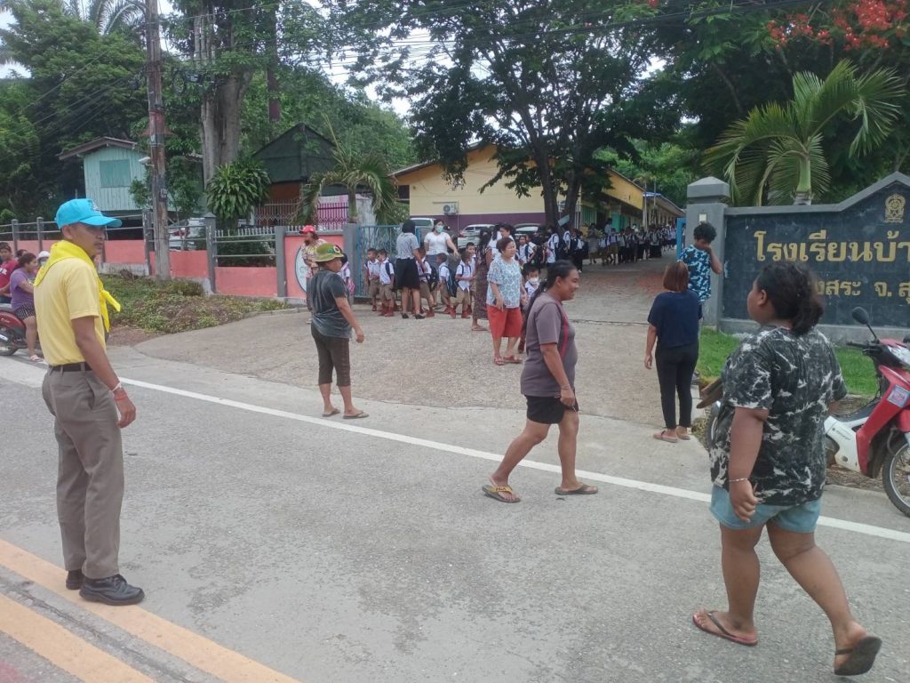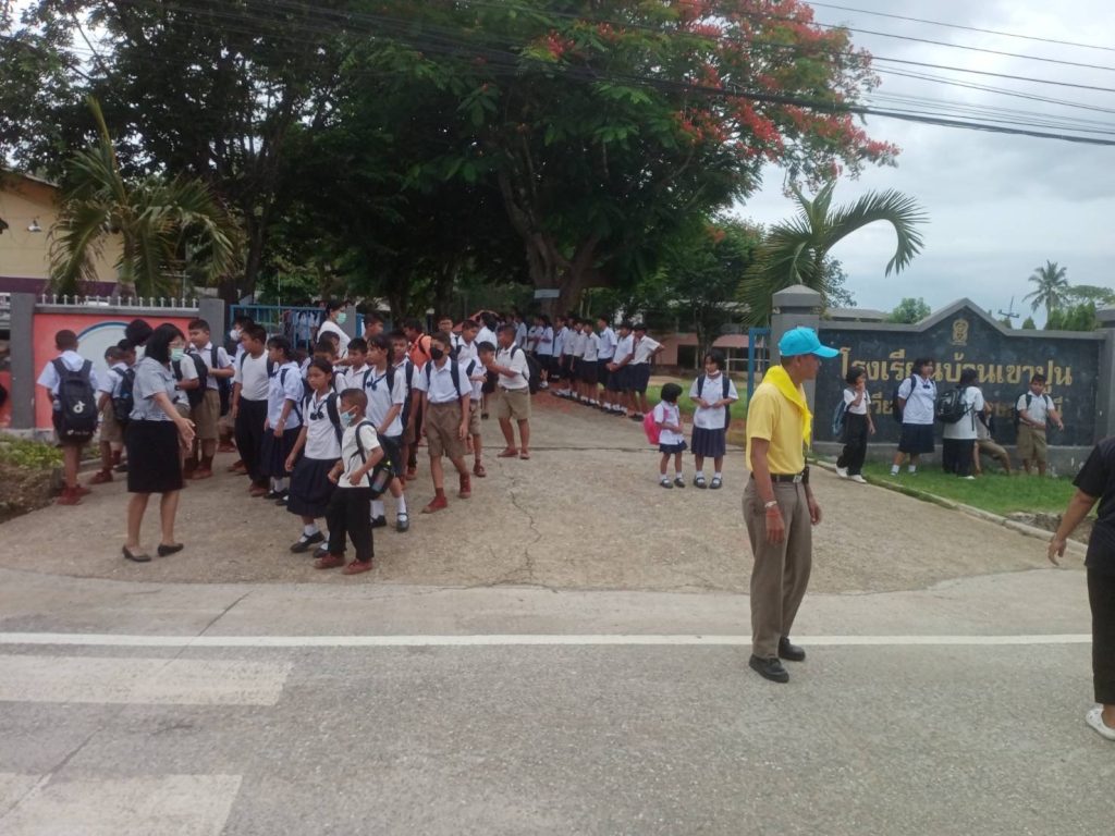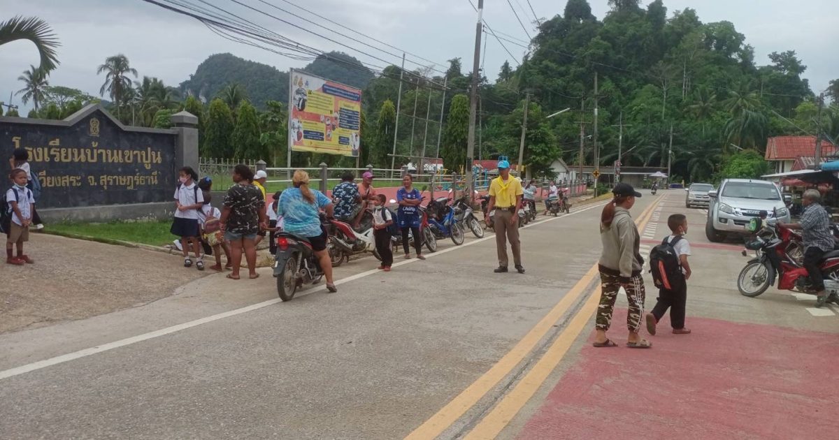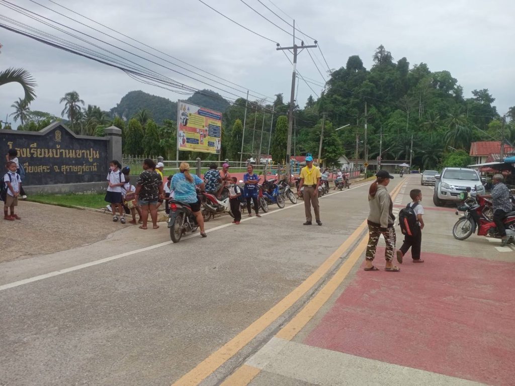 ดำเนินการอำนวยความสะดวกการจราจร ให้แก่เด็กนักเรียน ผู้ใช้รถใช้ถนนบริเวณ หน้าโรงเรียนเขาปูน