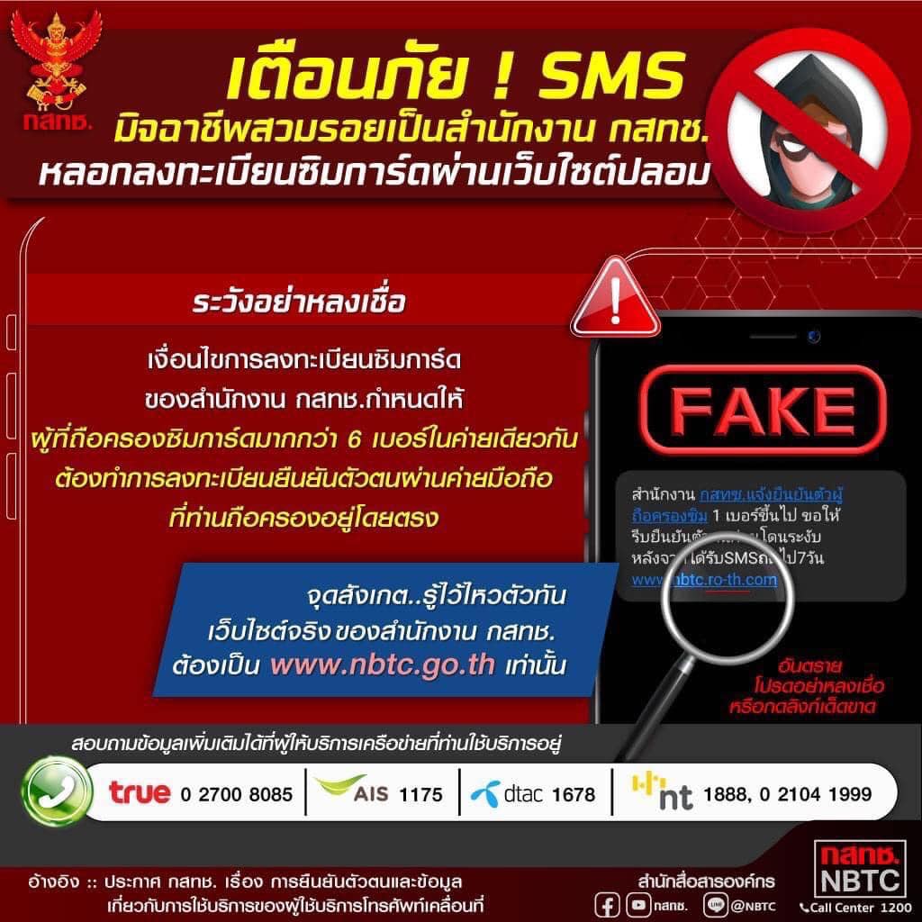 2. เว็บไซต์ลงทะเบียนที่แอบอ้างมาพร้อมกับ SMS นั้นไม่ใช่เว็บไซต์จริงของสำนักงาน กสทช. เว็บไซต์ที่ถูกต้อง คือ https://www.nbtc.go.th/ และ การลงทะเบียนยืนยันตัวตน ผู้ถือครองซิมการ์ดสามารถลงทะเบียนผ่านเครือข่ายซิมการ์ดที่ท่านถือครองได้โดยตรง