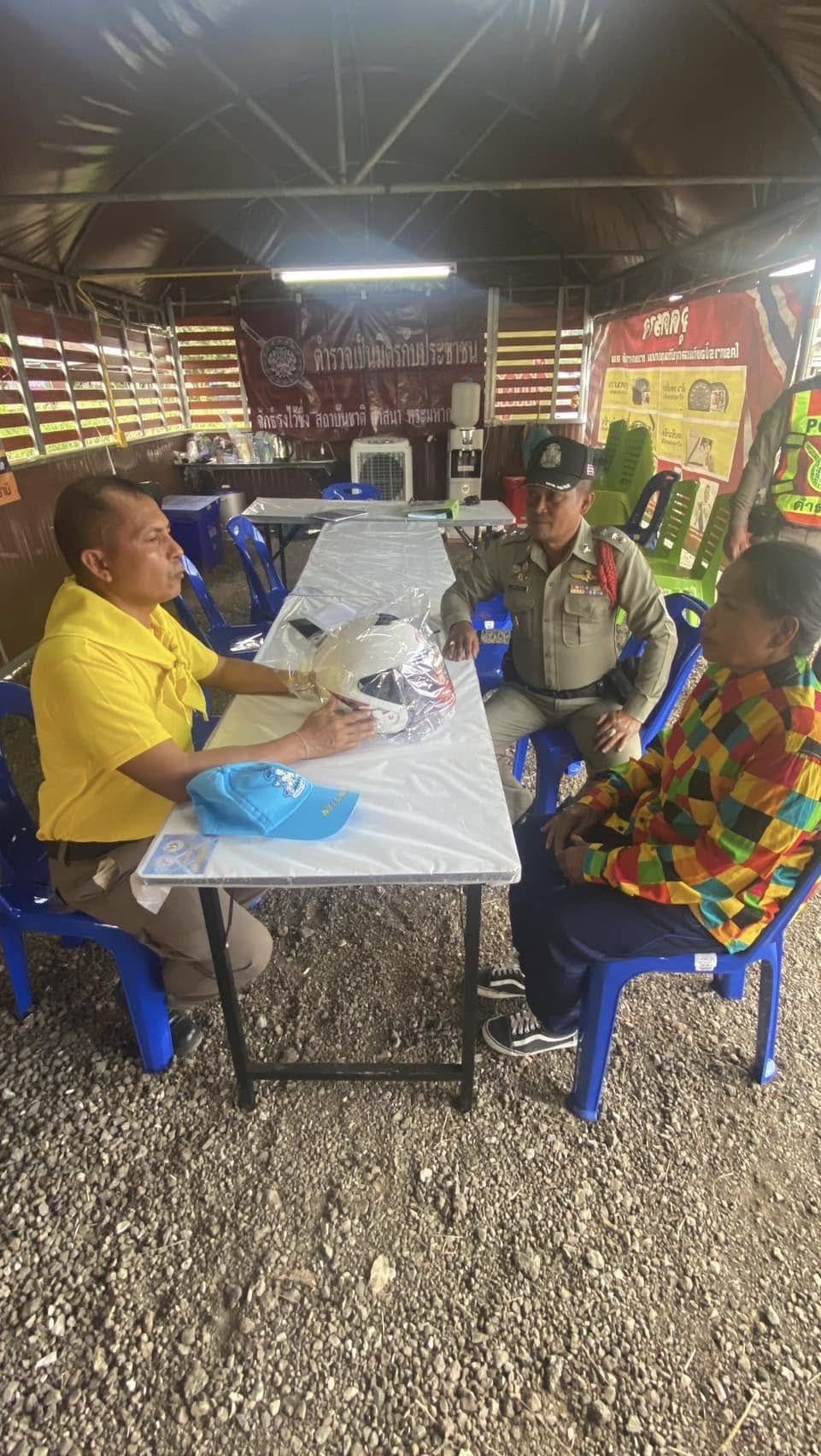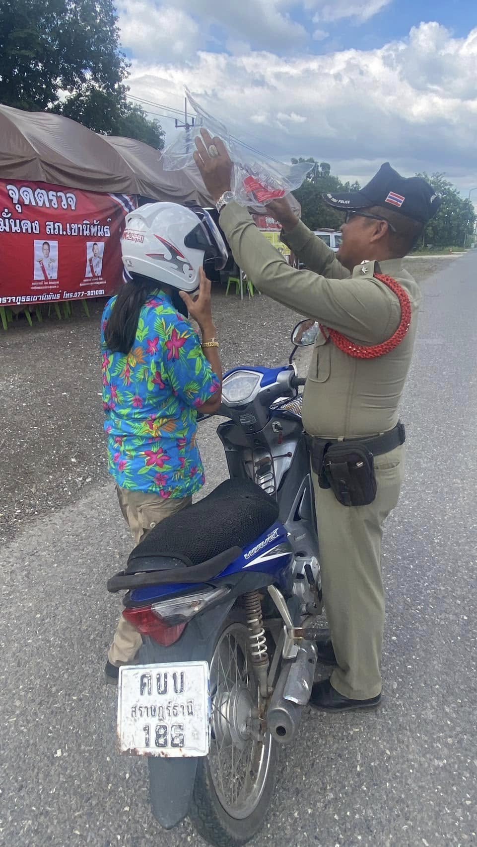 ประชาสัมพันธ์รณรงค์การปฏิบัติตามวินัยจราจรขับขี่ปลอดภัยให้สวมหมวกนิรภัยและอบรมให้ความรู้ ตักเตือนประชาชนที่ไม่สวมหมวกนิรภัย พร้อมทั้งมอบหมวกนิรภัยให้แก่ประชาชน