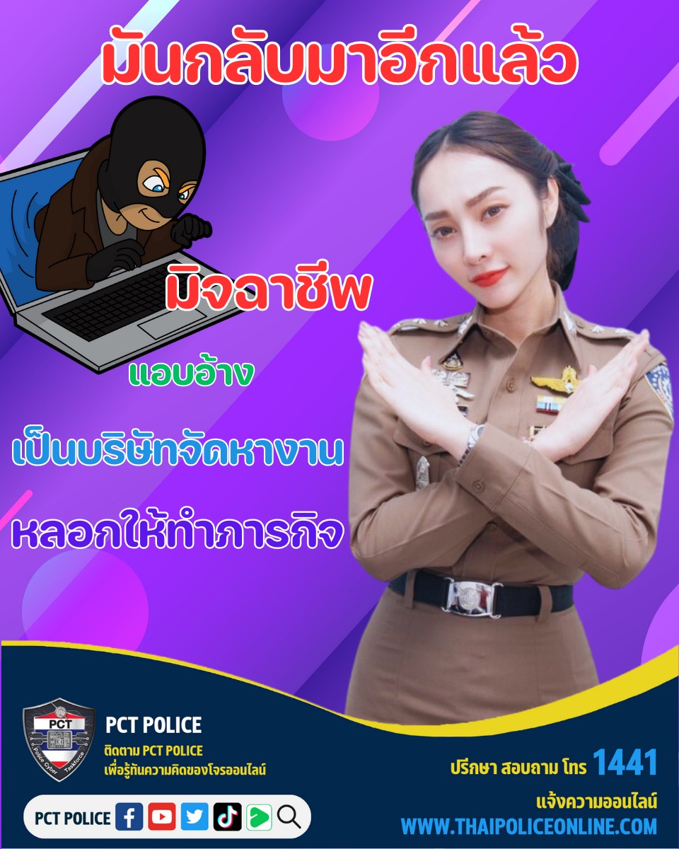 มิจฉาชีพแอบอ้างเป็นพนักงานบริษัทจัดหางาน ที่ผู้เสียหายติดต่อสมัครงาน เมื่อเหยื่อหลงเชื่อก็จะส่งลิงก์