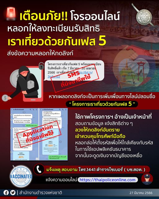 ไม่หลงเชื่อ ไม่คลิกลิงก์ ไม่คุย !! ตำรวจเตือนภัย .. โจรออนไลน์ หลอกให้ลงทะเบียนรับสิทธิเราเที่ยวด้วย